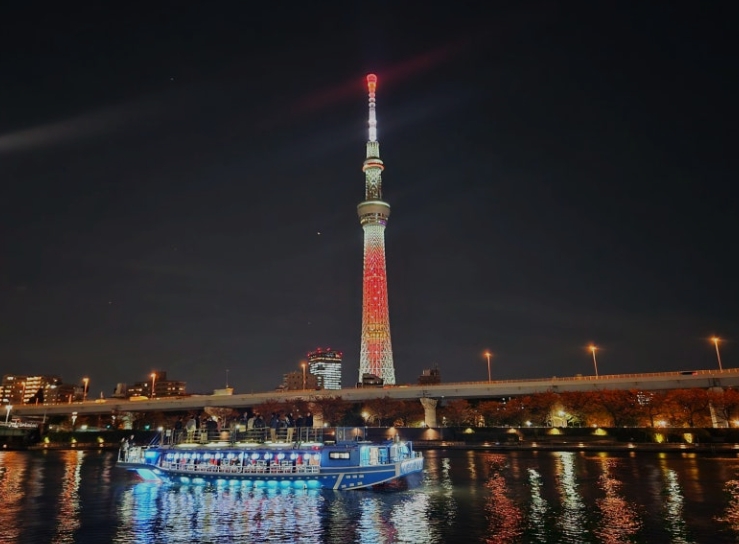 스카이트리 근처를 흐르는 스미다 강변은 조용한 산책과 아름다운 야경을 동시에 즐길 수 있는 장소입니다. 특히 밤에는 강 위를 비추는 스카이트리의 조명이 강물에 반사되어 낭만적인 분위기를 연출합니다.